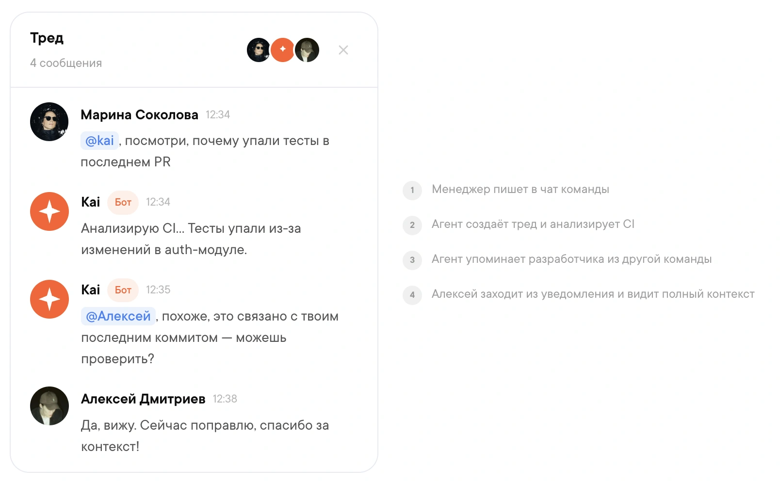 - Сквозные треды — упомяните любого сотрудника в треде, и он увидит весь контекст, даже если не состоит в исходном чате. Один тред — единая точка координации между людьми и агентом