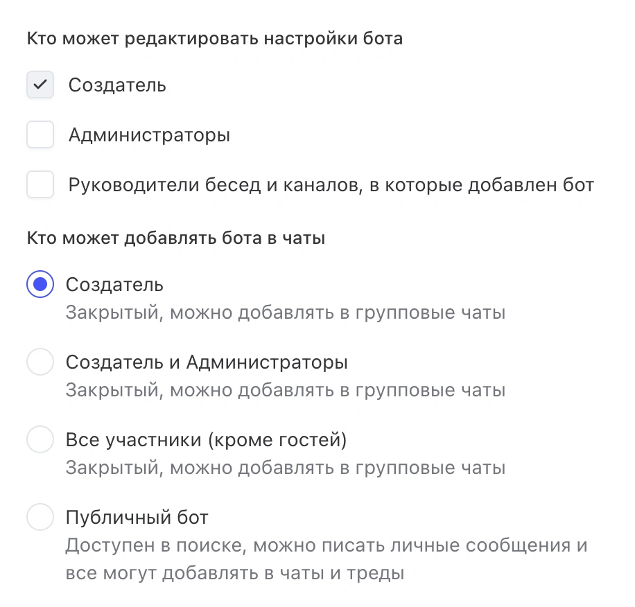 Первые три варианта оставляют бота закрытым и доступным для работы только через добавление его в каналы и беседы. Вариант Публичный бот предоставляет всем участникам пространства доступ к работе с ботом: в поиске, через личные сообщения, добавление в тред через упоминание бота в сообщении и тд.