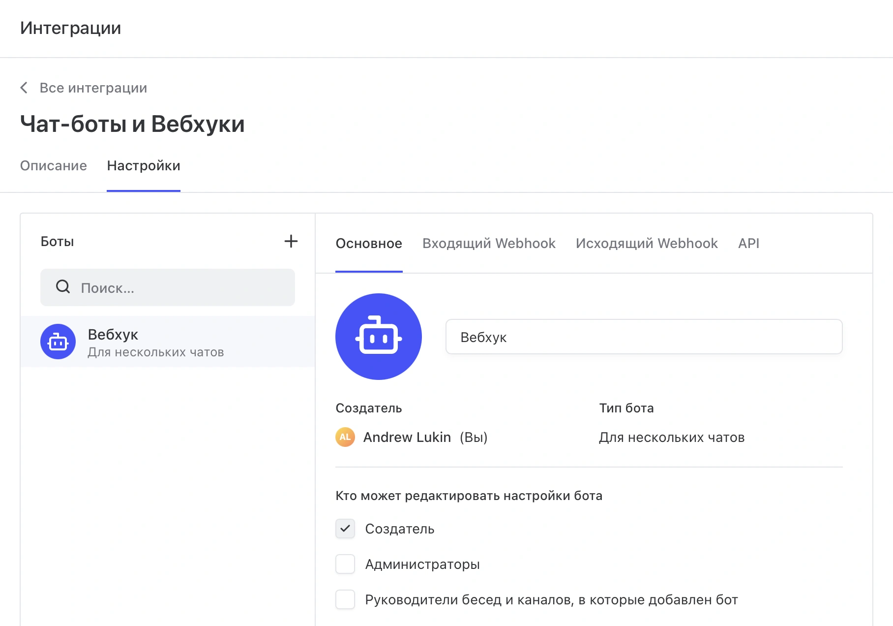 Управление доступов участников пространства к поиску бота в разделе Чат-боты и Вебхуки и редактированию его настроек (основных, вебхуков и токена API):