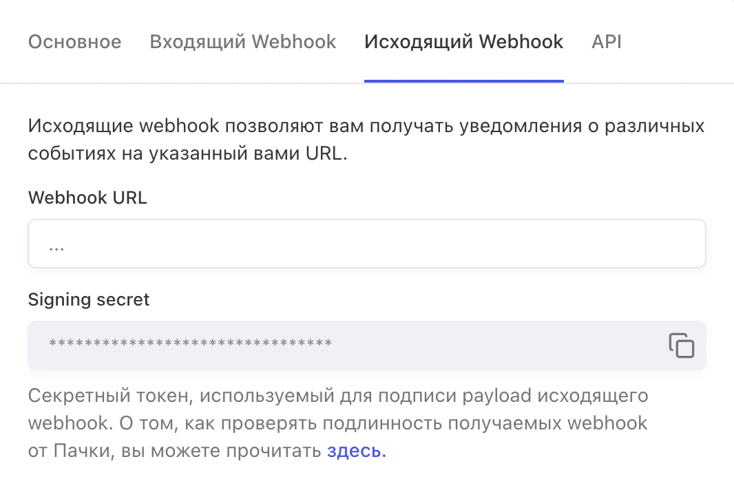 Для получения событий от Пачки перейдите на вкладку Исходящий Webhook: укажите Webhook URL, на который будут приходить уведомления, и выберите типы событий (новые сообщения, реакции, нажатия кнопок и другие). Подробнее — в разделе Исходящие вебхуки.