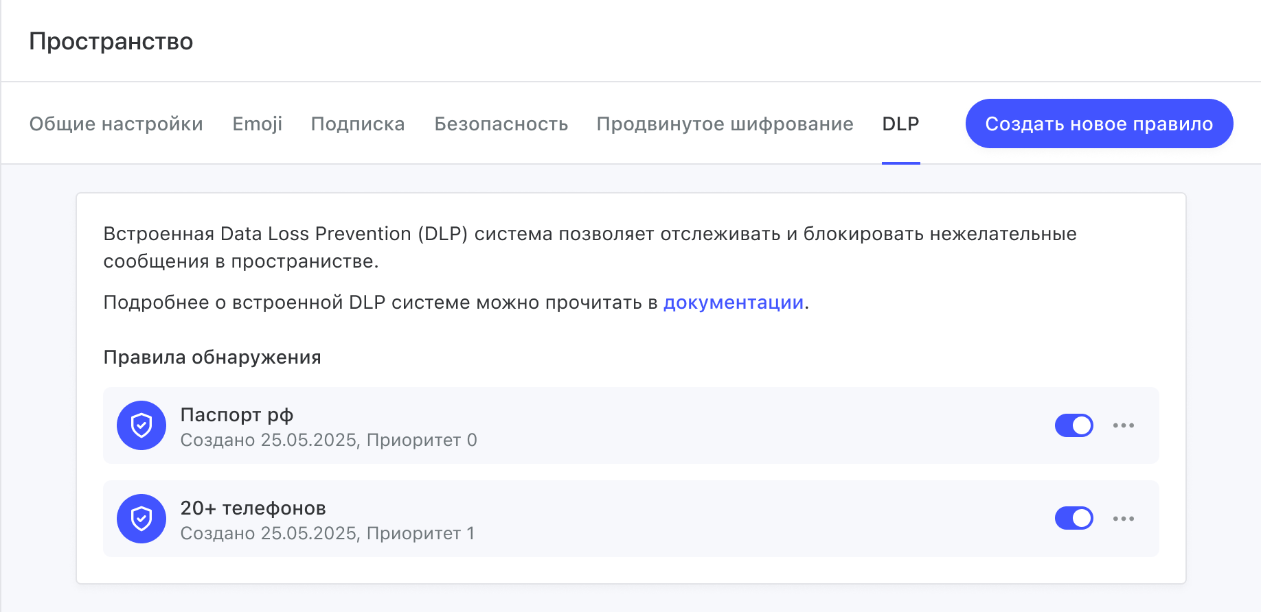 Управление правилами DLP-системы доступно в разделе «Настройки пространства» → «DLP». Вы можете изменять список правил, а также включать и отключать их.