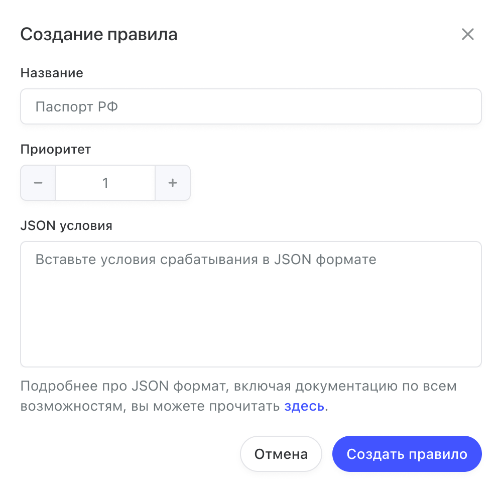 Чтобы внести новое правило нажмите на кнопку «Создать новое правило», укажите название правила (чтобы было проще его потом изменить или удалить), его приоритет и JSON объект условия.
