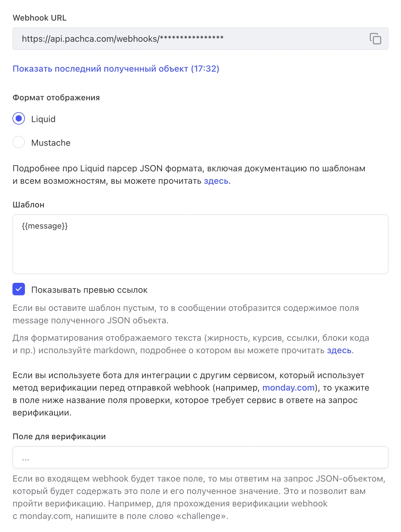 По умолчанию Пачка публикует содержимое поля message из входящего JSON. Если вместо готового текста вы хотите отправлять произвольную JSON-структуру и гибко формировать сообщение из её полей — укажите формат отображения и шаблон.