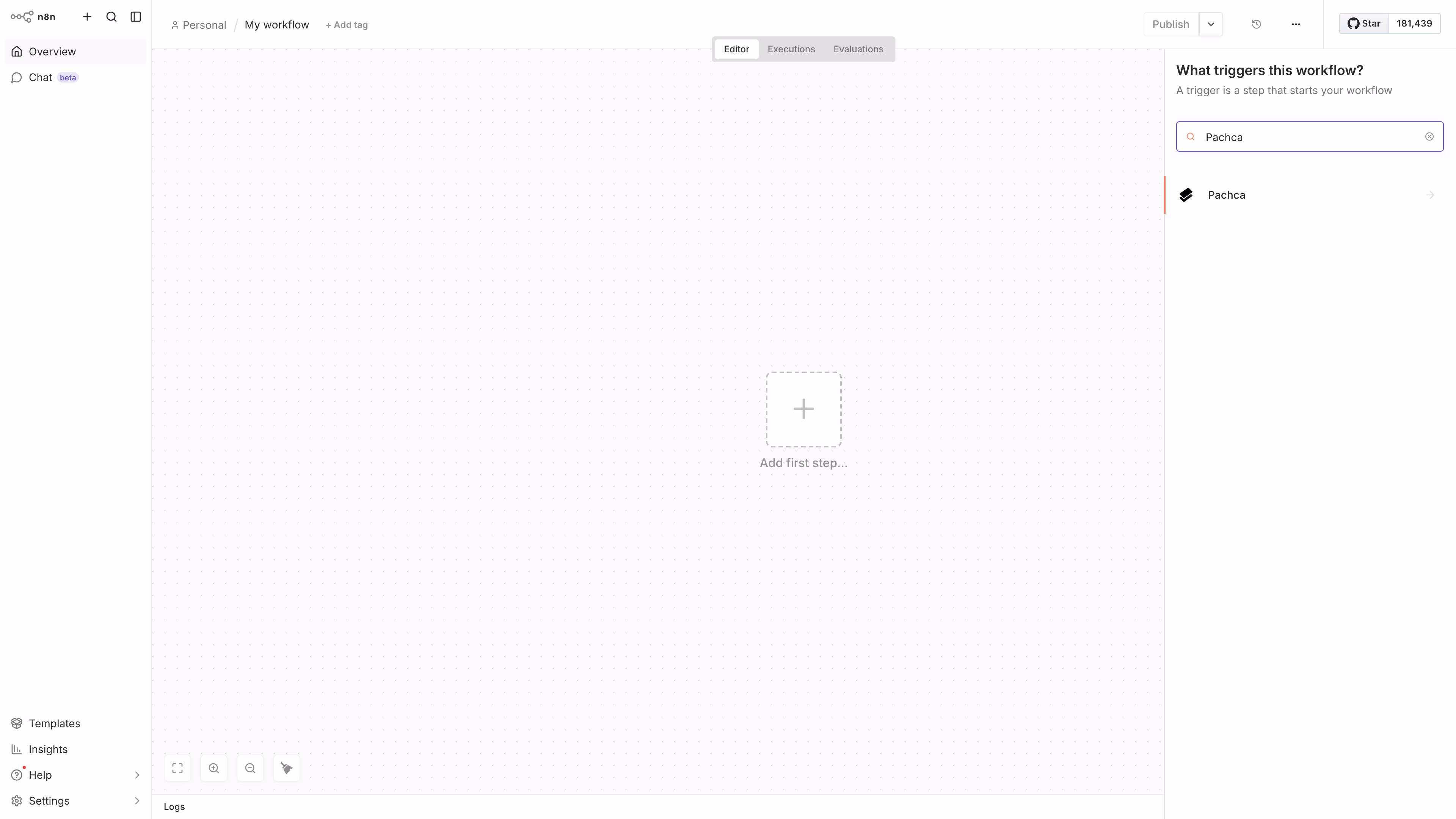 Добавьте узел Pachca Trigger в workflow — найдите его через поиск в панели узлов.