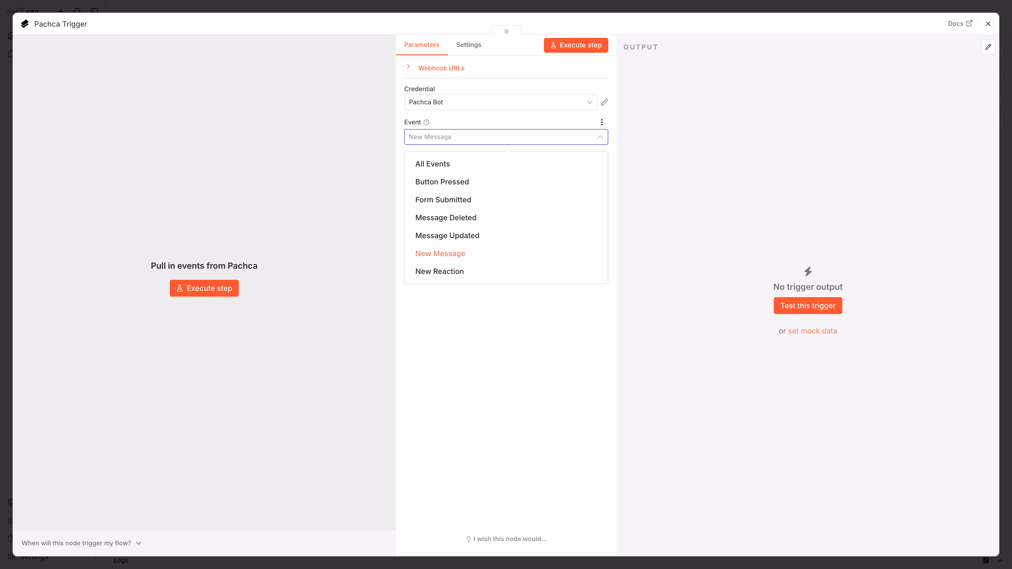 Создайте новый workflow и добавьте узел Pachca Trigger. Выберите нужный тип события.