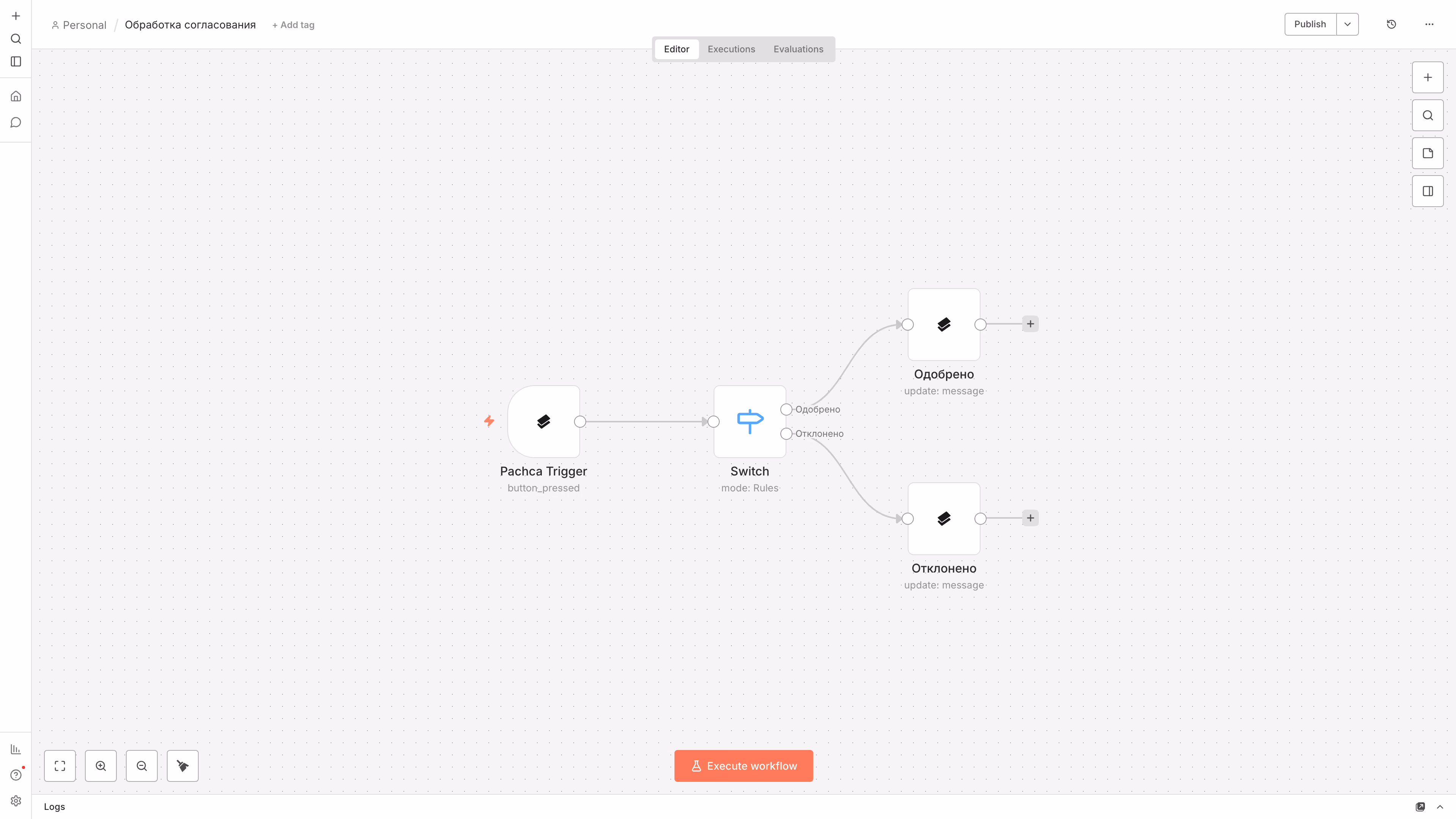 - Pachca (Message > Create) — отправка сообщения с кнопками «Согласовать» / «Отклонить»