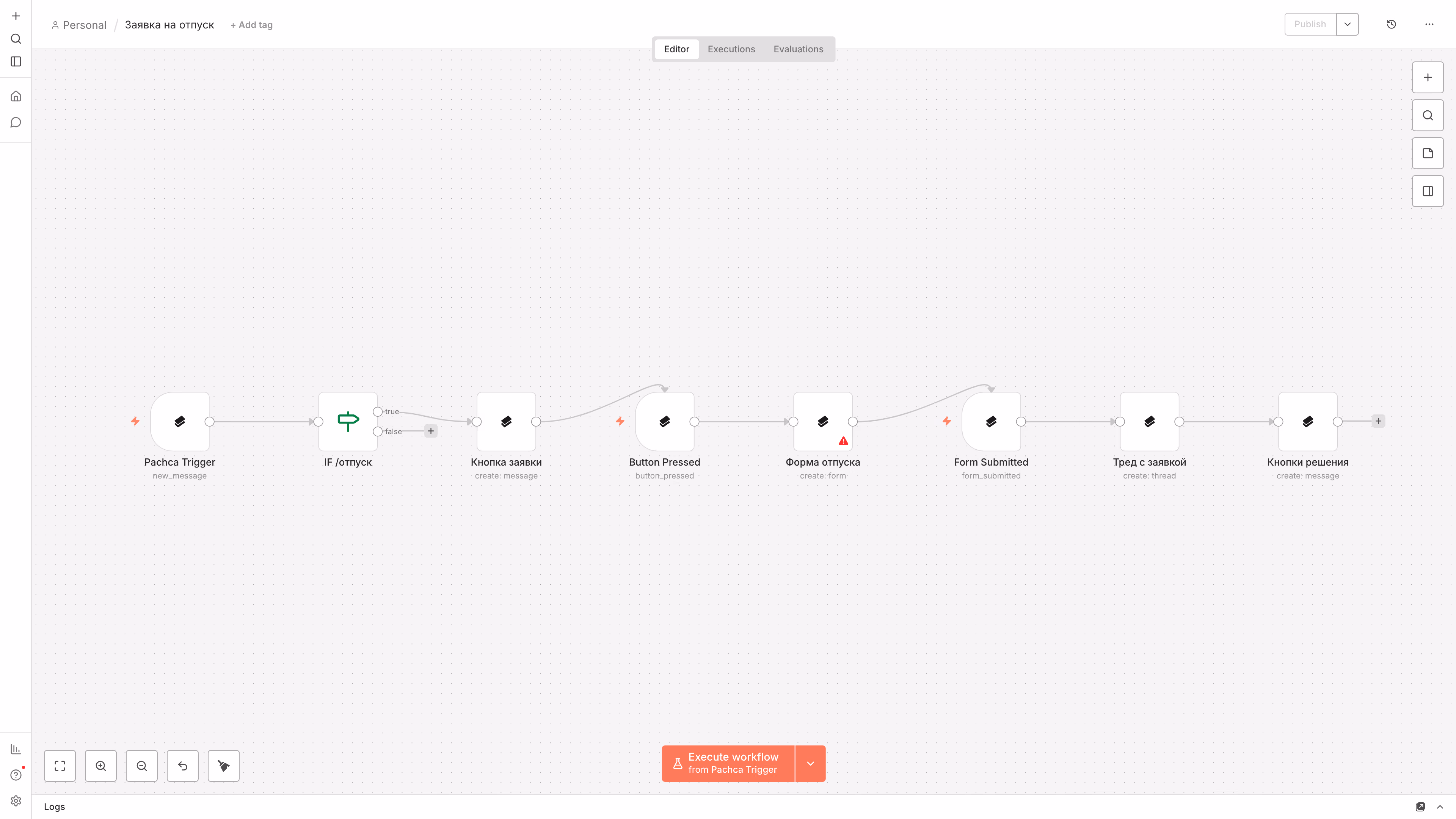 Заявка на отпуск: триггер → кнопка → форма → тред → согласование