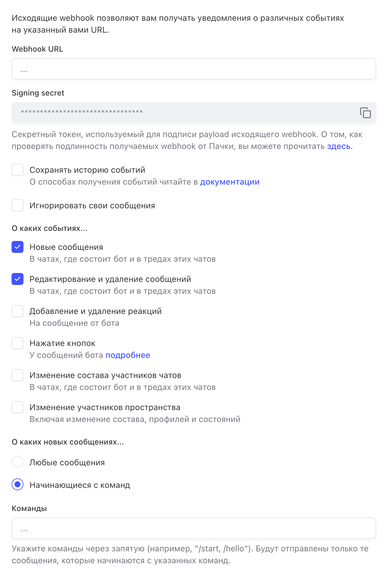 В настройках бота перейдите на вкладку Исходящий Webhook и укажите URL вашего сервера, на который Пачка будет отправлять события.